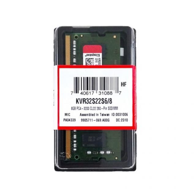 - Numero de parte: KVR32S22S6/8 - Capacidades: 8 GB - Frecuencias: 3200MT/s - Latencias: CL22 - Voltaje: 1.2V - Temperatura de funcionamiento: De 0 °C a 85 °C - Dimensiones: 69,6x30mm