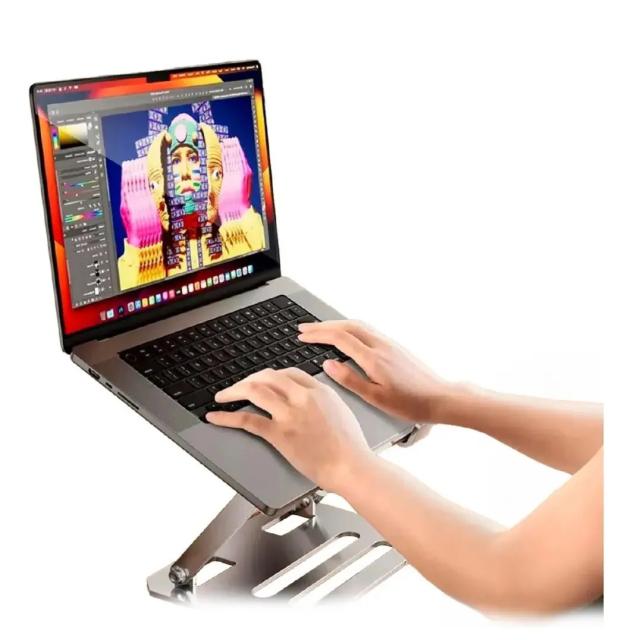 Trabaja cómodo y cuida tu postura con este soporte de notebook ajustable. Fabricado en metal resistente y con almohadillas antideslizantes, mantiene tu equipo seguro mientras estudias o trabajas.